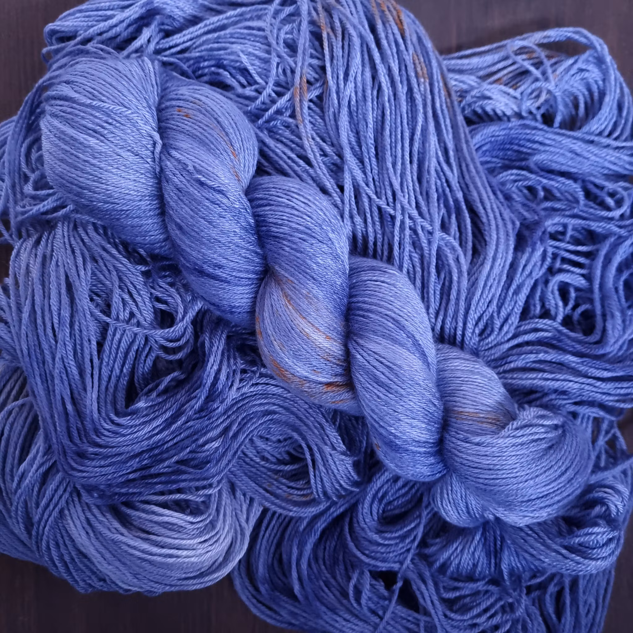 Olabukseblå med rust og blå spetter. Passer fint sammen med Ola100g/400m50% merino, 50% silkeGarnet er ikke superwashbehandla, og kan tove ved for varm/hard vas