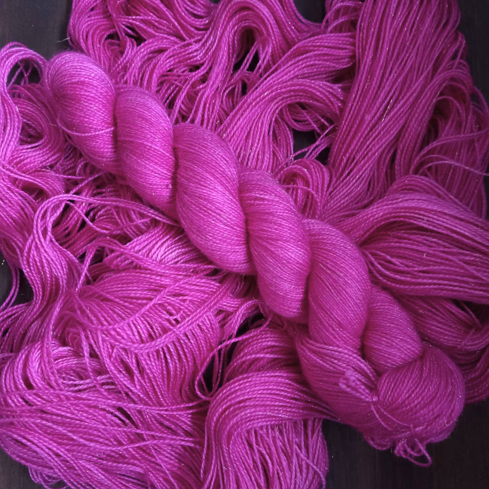 Semisolid knall rosafarge som heller litt mot det lilla.Finnes også i luksus lace.100 grams hespe, ca 400 meter75% superwash merino, 20% nylon, 5% gullglitter.